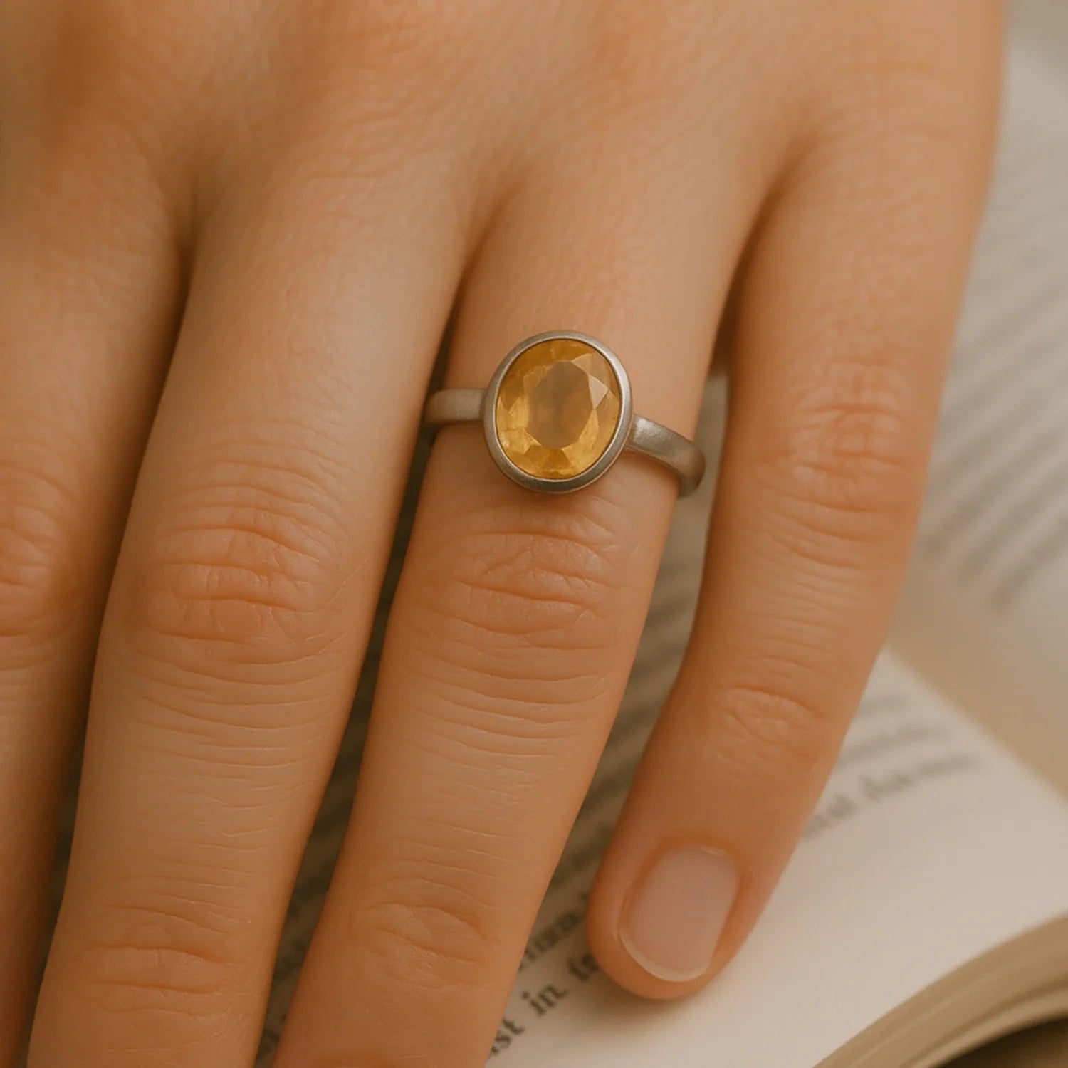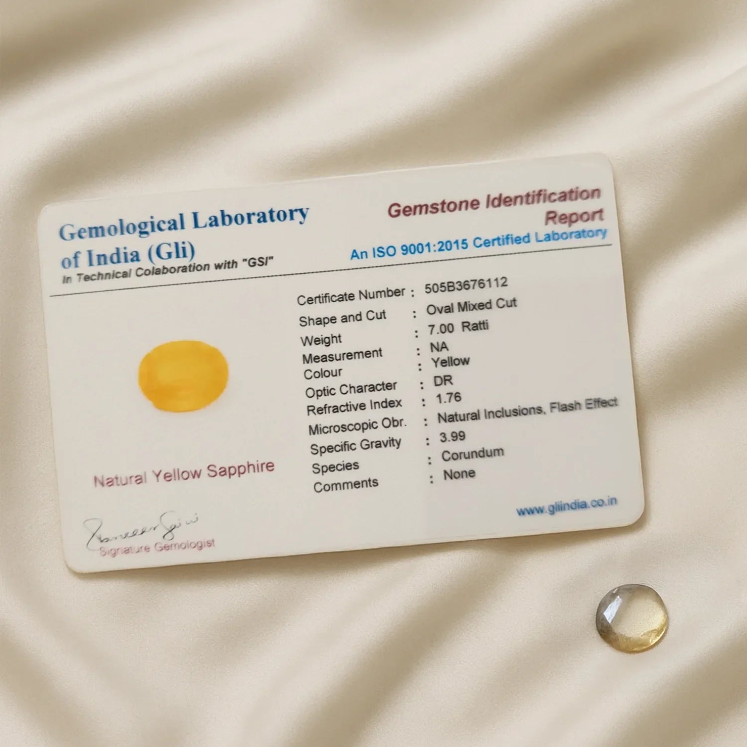 Pukhraj is a shiny yellow gemstone from Bangkok. It is linked to the planet Jupiter and brings luck, money, and success. People wear it to grow in career and get peace and happiness.